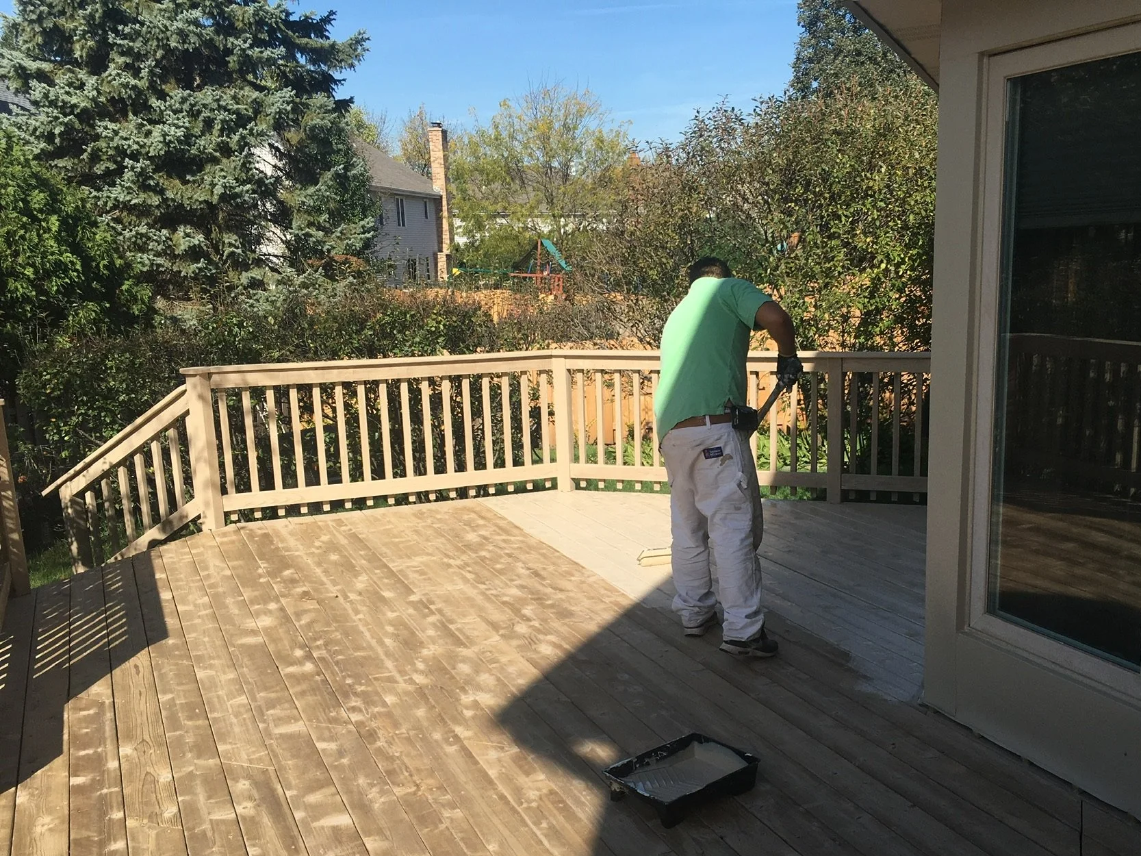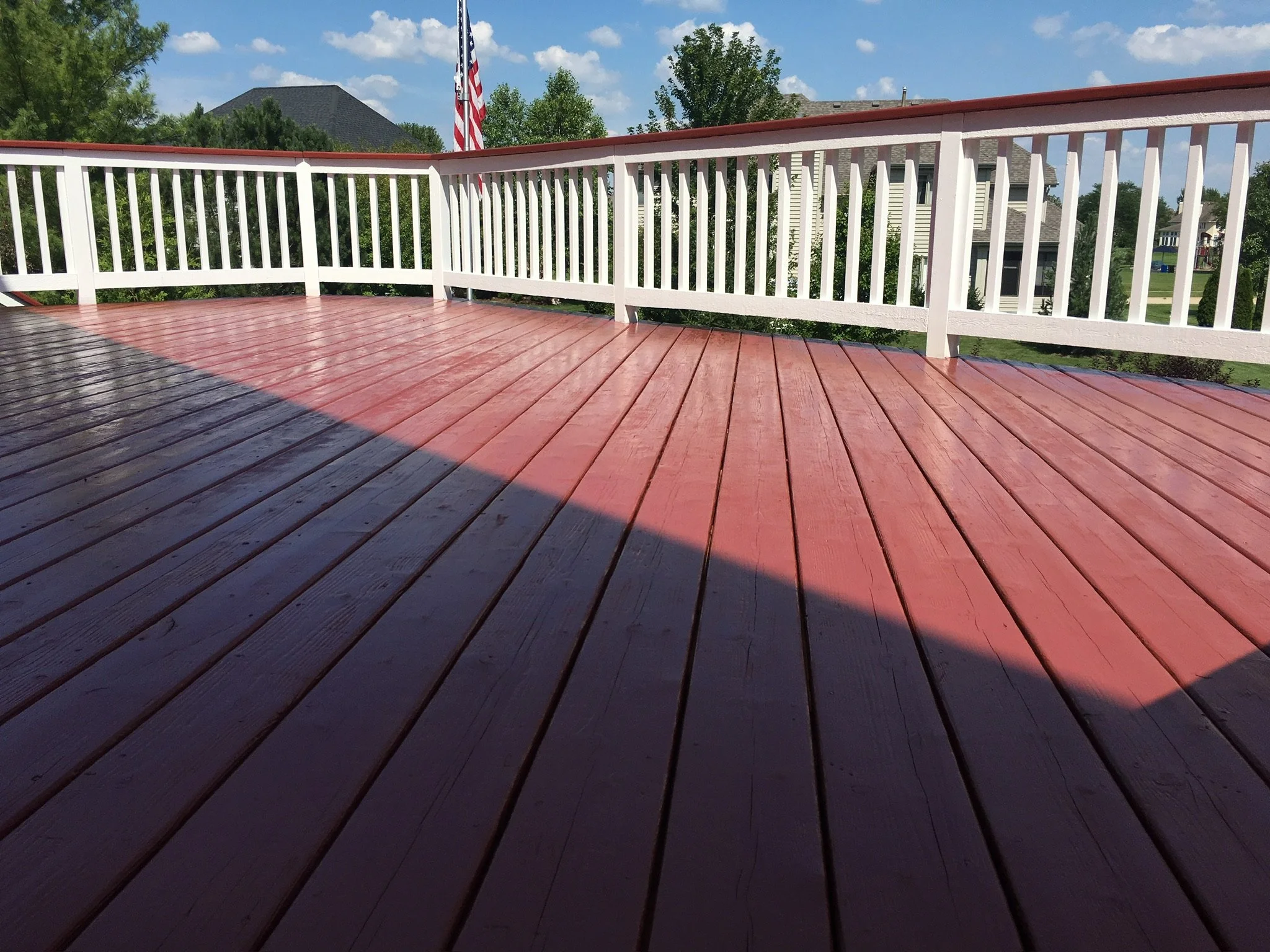 We thoroughly clean and prep the wood, removing dirt, old stain, and buildup to ensure the new finish properly adheres and lasts longer.